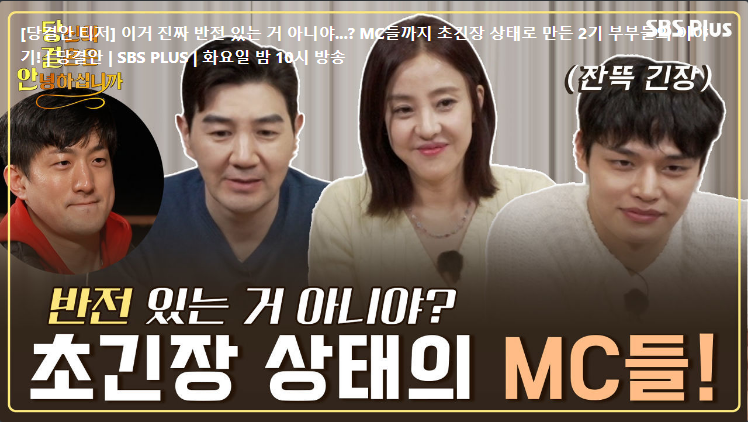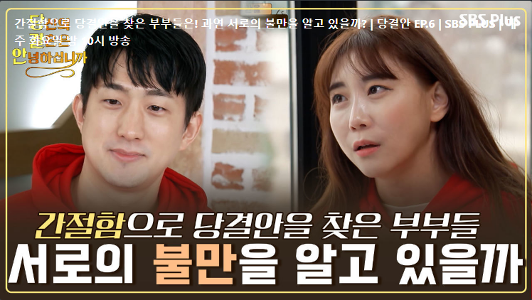 불꽃튀는 리얼 합숙 이야기 감정폭발 쏟아지는 부부들의 속마음 당결안2 매주 화요일 밤 10시 방송불꽃튀는 리얼 합숙 이야기 감정폭발 쏟아지는 부부들의 속마음 당결안2 매주 화요일 밤 10시 방송 다시 떠오르는 상처 받은 그날, 과연 부부의 방에서의 만남은 성사됐을까 당결안2 매주 화요일 밤 10시 방송 들어보세요 제가 이상한가요 제 배우자가 이상한가요 아내들의 이상한 사연은 당결안2 매주 화요일 밤 10시 방송 풀지 못한 오해와 상처, 부부들은 대화를 통해 서로를 이해할 수 있을까 당결안2 매주 화요일 밤 10시 방송 내 행복했던 순간은 없어진 거야 자꾸만 엇갈리는 두 사람의 감정 당결안2 매주 화요일 밤 10시 방송 다른 사람이 보는 우리 부부의 모습은 이야기 속 점점 높아지는 부부의 언성 당결안2 매주 ..